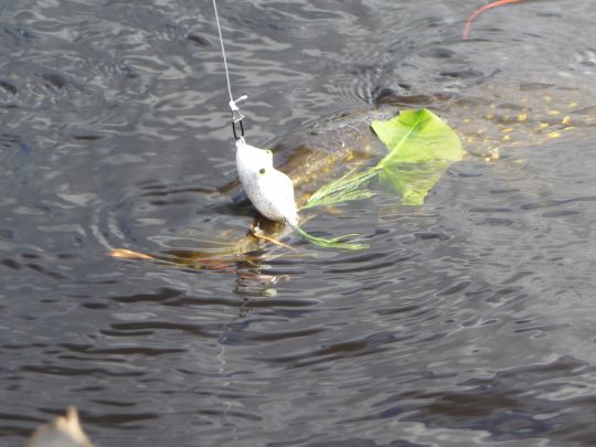 Una última forma de pescar en la superficie es utilizar señuelos blandos de sábalo, a menudo provistos de un anzuelo Texas y sin peso. Al tirar del señuelo hacia atrás de forma lineal, la pala del señuelo agitará la superficie del agua y dejará una marca visible en la superficie. Es la forma más discreta de pescar en la superficie y suele reservarse para condiciones difíciles, pero también para lugares donde hay vegetación en la superficie para evitar enganches indeseados.