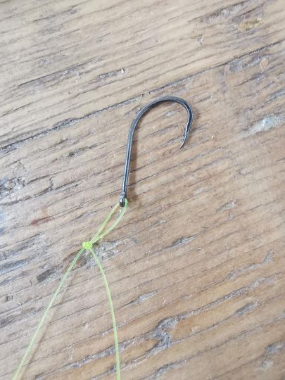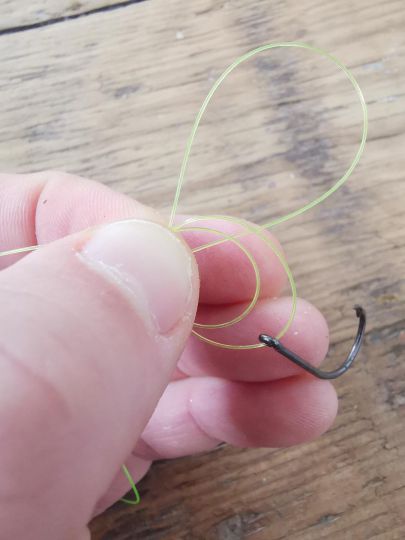 Forma un bucle, con la hebra principal aguas arriba del ojo del anzuelo.