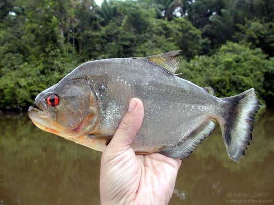 Especie legendaria, la piraña negra es la más grande de su familia, con 50 cm y 3 kg de peso. De forma redondeada y aplanada, vive en bancos y puede encontrarse tanto en zonas de fuertes corrientes como en otras más lentas y profundas. Sus famosos dientes son especialmente impresionantes y afilados. Hay que tener mucho cuidado al desengancharlo o se corre el riesgo de sufrir una fea herida.