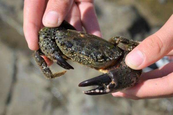 Cangrejo de aspecto beligerante con pinzas sobredimensionadas y temibles. Su caparazón, entre marrón y amarillo, es aplanado y le gustan las grietas. Cangrejo de zonas rocosas que puede encontrarse tanto en la orilla como en rocas sumergidas más profundas.