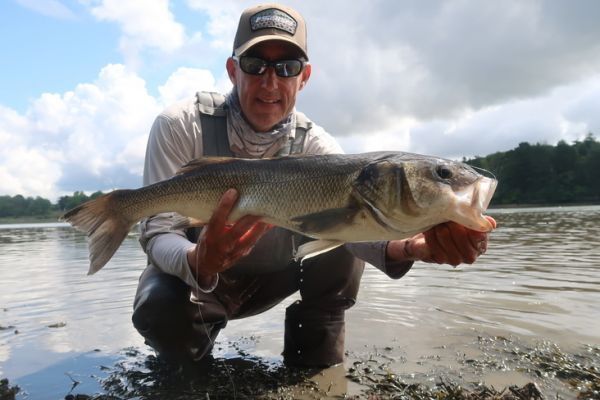 Entonces no hubo duda, era una lubina y además grande. Es soberbia, oscura y nadando suavemente en 20 cm de agua ¡con la espalda y la aleta dorsal fuera del agua! ¡Increíble! Le lance mi mosca sin creérmelo realmente, muy cerca de su cabeza para que la viera ya que estaba en muy poca agua. Como en la cola de una palometa o un macabí. El acelera hacia ella. ¡Estoy muy sorprendido y se la quito de la boca! ¡Ay! ¡Falló!
