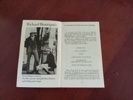Richard Brautigan (1935-1984) es sin duda un escritor un poco "loco", campeón de la generación hippy. El título original es Trout fishing in america, publicado por primera vez en 1967 en Estados Unidos, fue traducido al francés por Marc Chénétier en 1978. Trout fishing in america vendió más de 2 millones de ejemplares: "Algunos de sus lectores le enviaban truchas. Eran como un tótem", se lee en la contraportada.