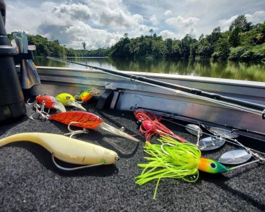 El señuelo blando es muy superior en cuanto a resultados. Debe ser un señuelo flotante, de 120 a 180 mm de tamaño. Las marcas locales tienen una relación calidad-precio inmejorable: OZMY Silencer / Paddle pop, EUPRO K2 y Johncoo. Hay que favorecer los señuelos de TPE por su durabilidad y su capacidad para pasar por encima de obstáculos y vegetación tropical sin cansarse demasiado rápido. Se montan en anzuelos tejanos de tamaños 8/0 a 12/0, reforzados 4X a 5X, como OPASS Heavy Worm, Ozmy silencer o VMC 7348Bn.