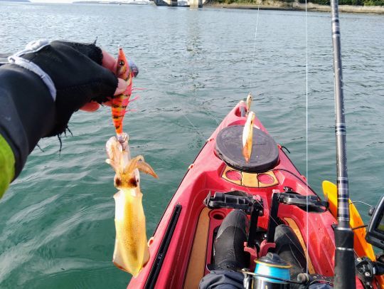 Los otros dos pescadores que estaban conmigo vieron claramente la diferencia en el número de capturas, y esto se repitió el segundo día. Hubo algunos buenos tubos, pero muy pocas sepias, lo que me pareció bien, ya que tienden a ensuciar más el kayak que los calamares cuando salen del agua.