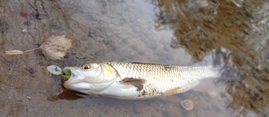 En segundo lugar, pesco río arriba y animo mi pequeño jerkbait de entre 5 cm y 7 cm con algunos golpes de púa. El ataque no es necesariamente brutal, a veces se trata de resistencia, otras veces los golpes son más bien finos y no es raro perder peces que empujan el señuelo sin agarrarlo realmente. En un mismo charco, es posible dar con varios peces, algunos de ellos bastante grandes.