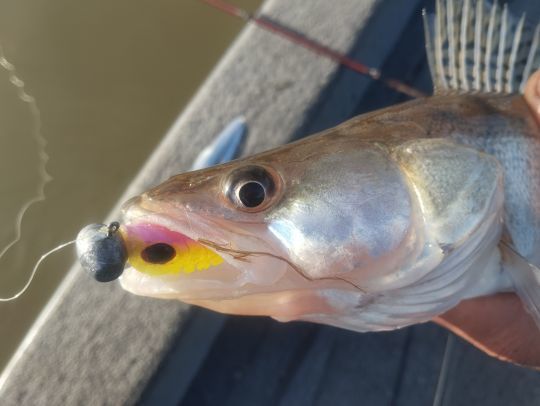 Voy rotando los señuelos para ver si hay alguno que marque la diferencia. Al salir de un lecho de maleza con un grub lo tengo succionado. En el anzuelo noto que pesa. ¿Podría ser una bonita lucioperca o un lucio? Resultó ser un bonito áspid que vino a la barca, una agradable sorpresa.