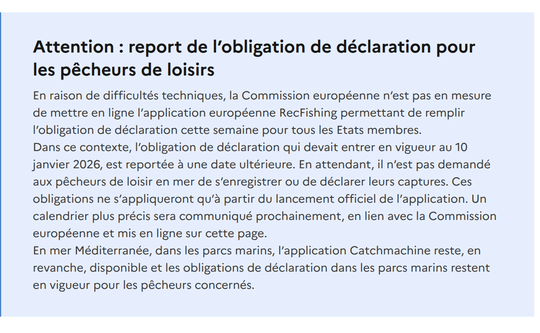 A partir del 10 de enero de 2026, la obligación de declarar a los pescadores de caña de mar con fines recreativos, que debía entrar en vigor, ha quedado oficialmente aplazada hasta una fecha posterior en Francia.âeuros