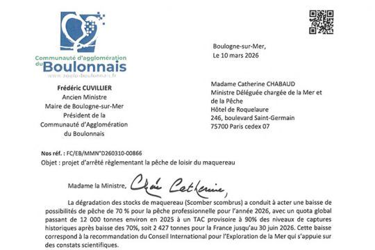 La disputa política en torno a la cuota de cinco caballas diarias para la pesca recreativa adquiere una nueva dimensión. En una carta enviada el 10 de marzo a Catherine Chabaud, Ministra francesa de Mar y Pesca, Frédéric Cuvillier, diputado y alcalde de Boulogne-sur-Mer, pide que se revise el límite fijado en el proyecto de decreto.