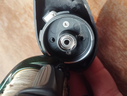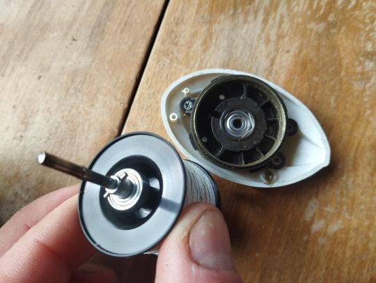 Para el rodamiento del lado del cigüeñal, hay que aflojar completamente la tapa del freno del carrete. En este modelo, pasa justo entre las palas de freno, así que no hay nada que quitar. Tenga cuidado, hay un muelle debajo de esta tapa. Entonces tendrás acceso directo al rodamiento, que es del mismo tamaño que el otro, es decir, 3x10x4.
