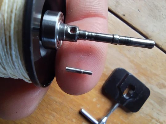 El cojinete izquierdo está fijado directamente al eje del carrete, por lo que es necesario desmontar el carrete para acceder a él. Está sujeto por un pasador metálico. Para retirar el pasador y acceder al rodamiento se utiliza una herramienta especial. Las dimensiones del cojinete son 5x11x4.