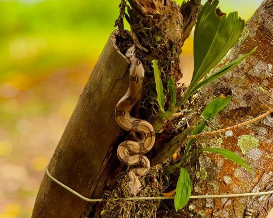 Esta es sin duda una de las fotos más bonitas que hicimos durante nuestra estancia: una pequeña boa constrictor bordeando tranquilamente un tocón de árbol mientras tomaba el sol. Por suerte, estábamos cerca para inmortalizar el momento.