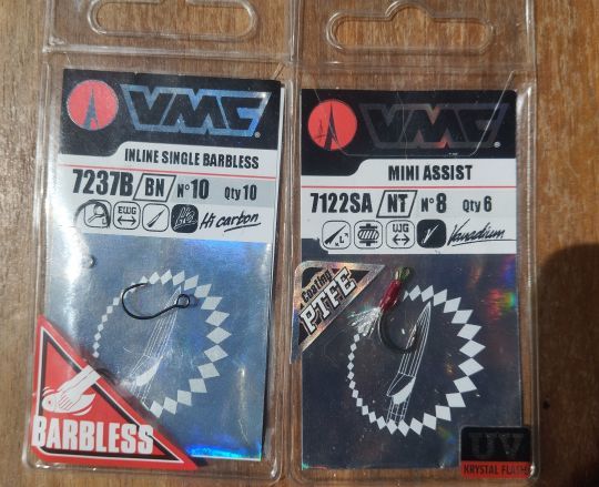 Siguiendo con VMC, he utilizado ganchos en línea 7237B que también me han dado plena satisfacción. Utilizo n°10s para el tamaño de 30 mm, n°8s para el tamaño de 40 mm y n°6s para el tamaño de 50 mm.